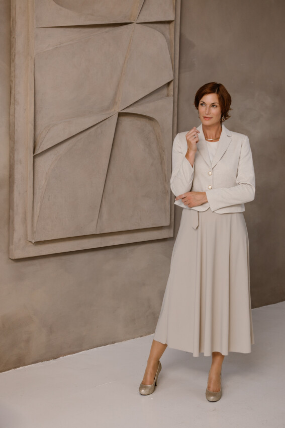 LILYTIME | Blazer Karlijn | Zand | 259,95 & LILYTIME | Rok Sonja | Zand | 149,95 | Blouse Nella Wit | 129,95